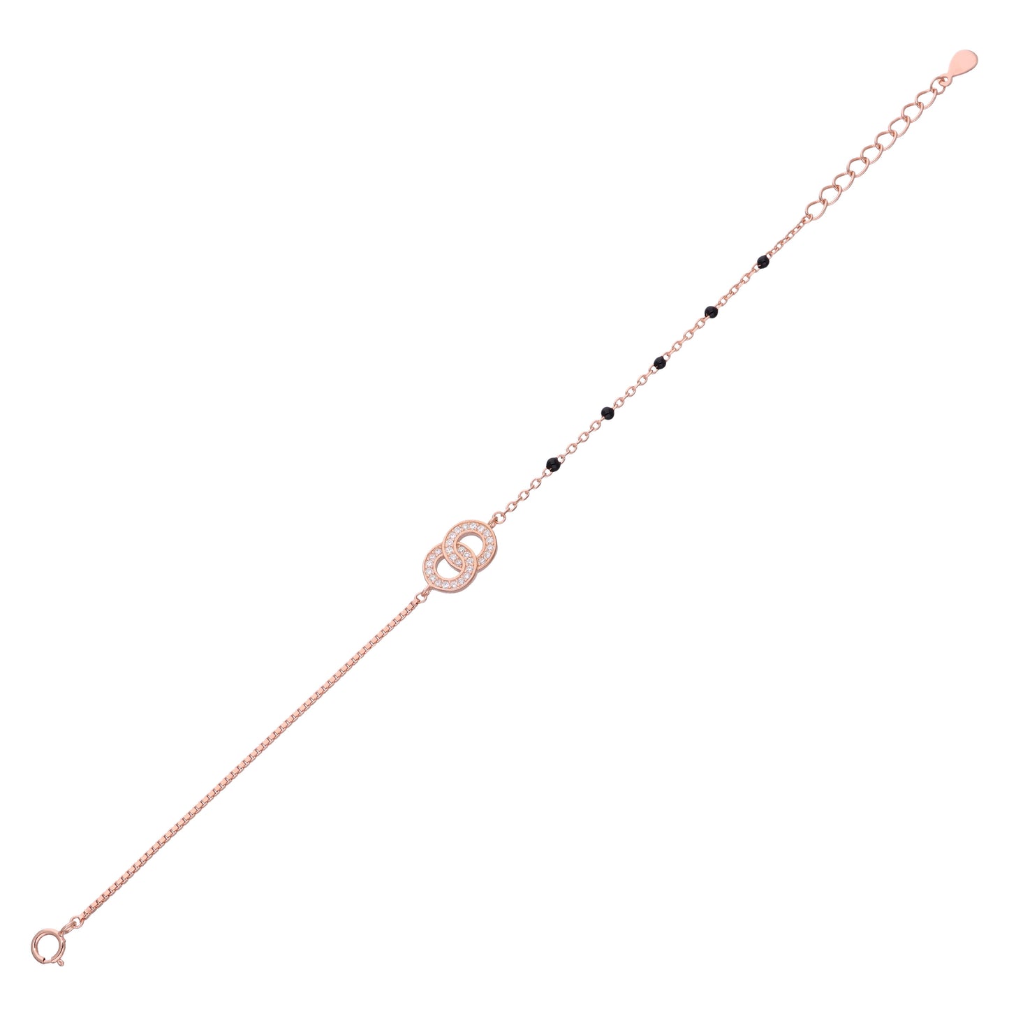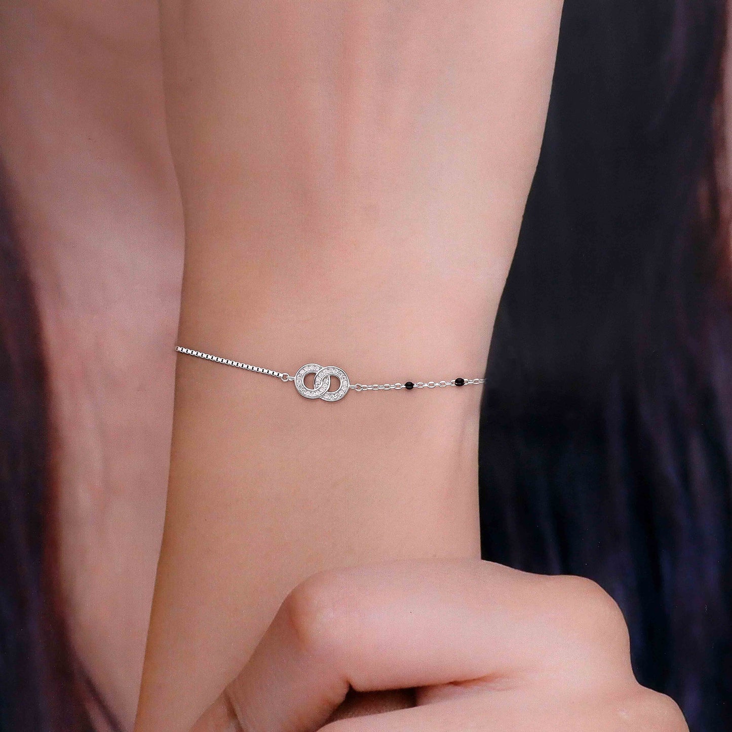 Regular price Rs. 3,350.00Elevate your accessory collection with this sophisticated silver bracelet, where interlocking circles adorned with sparkling stones create an eye-catching focal point. Black beads interspersed along the delicate chain add refined contrast and visual depth. Crafted from premium silver, this piece combines aesthetic appeal with lasting durability and comfortable wear. Whether for everyday elegance or special occasions, this bracelet serves as a versatile statement piece that seamlessly complements any wardrobe. A timeless investment in quality jewelry design.
