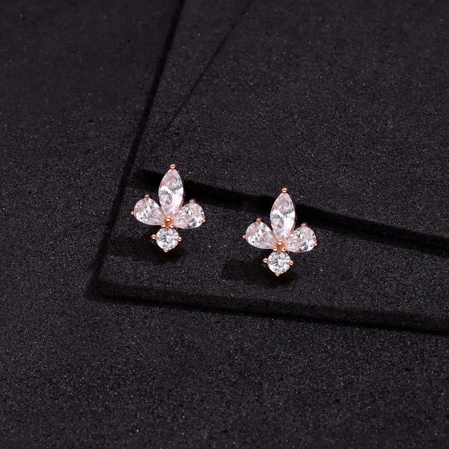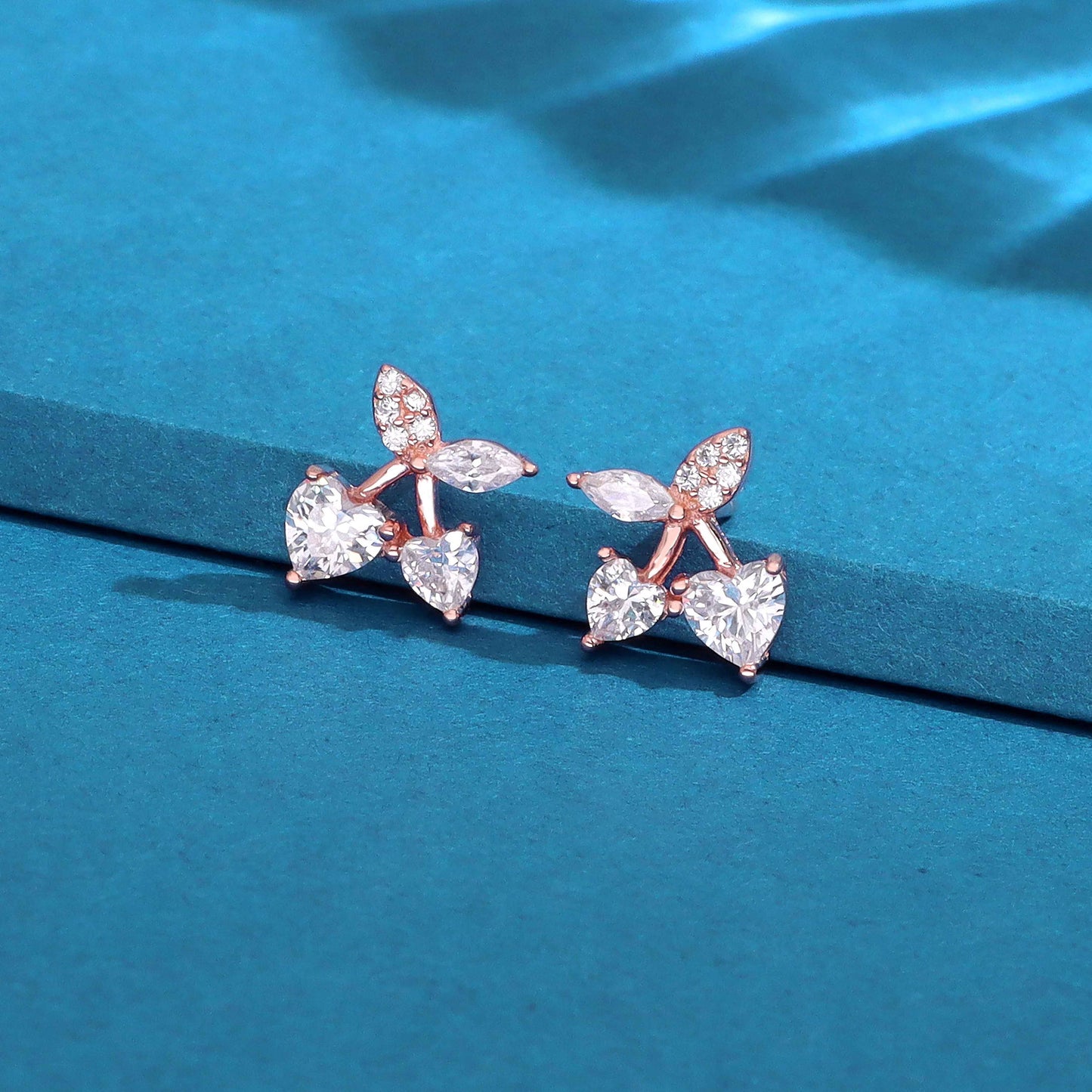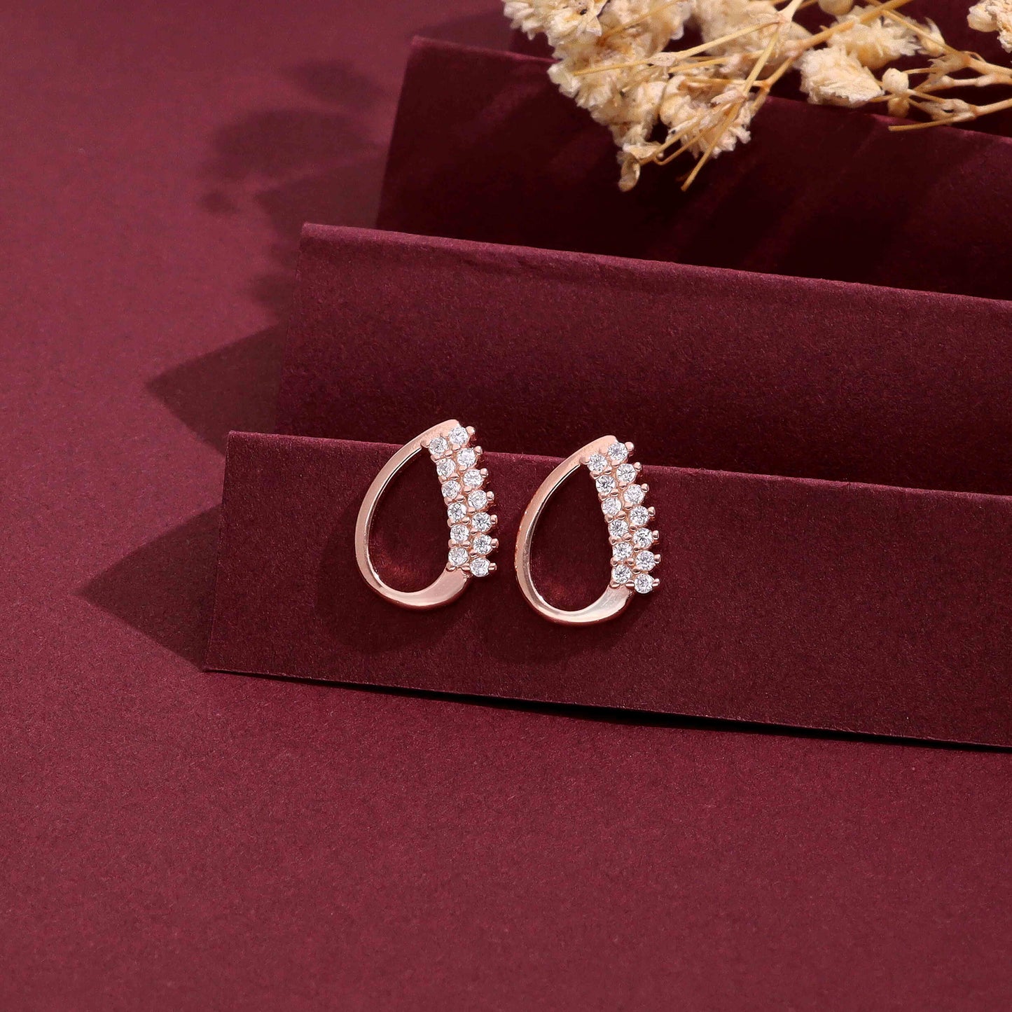 Rose gold teardrop stud earrings with round and baguette cubic zirconia stones