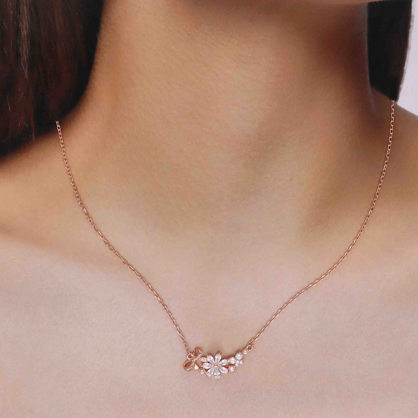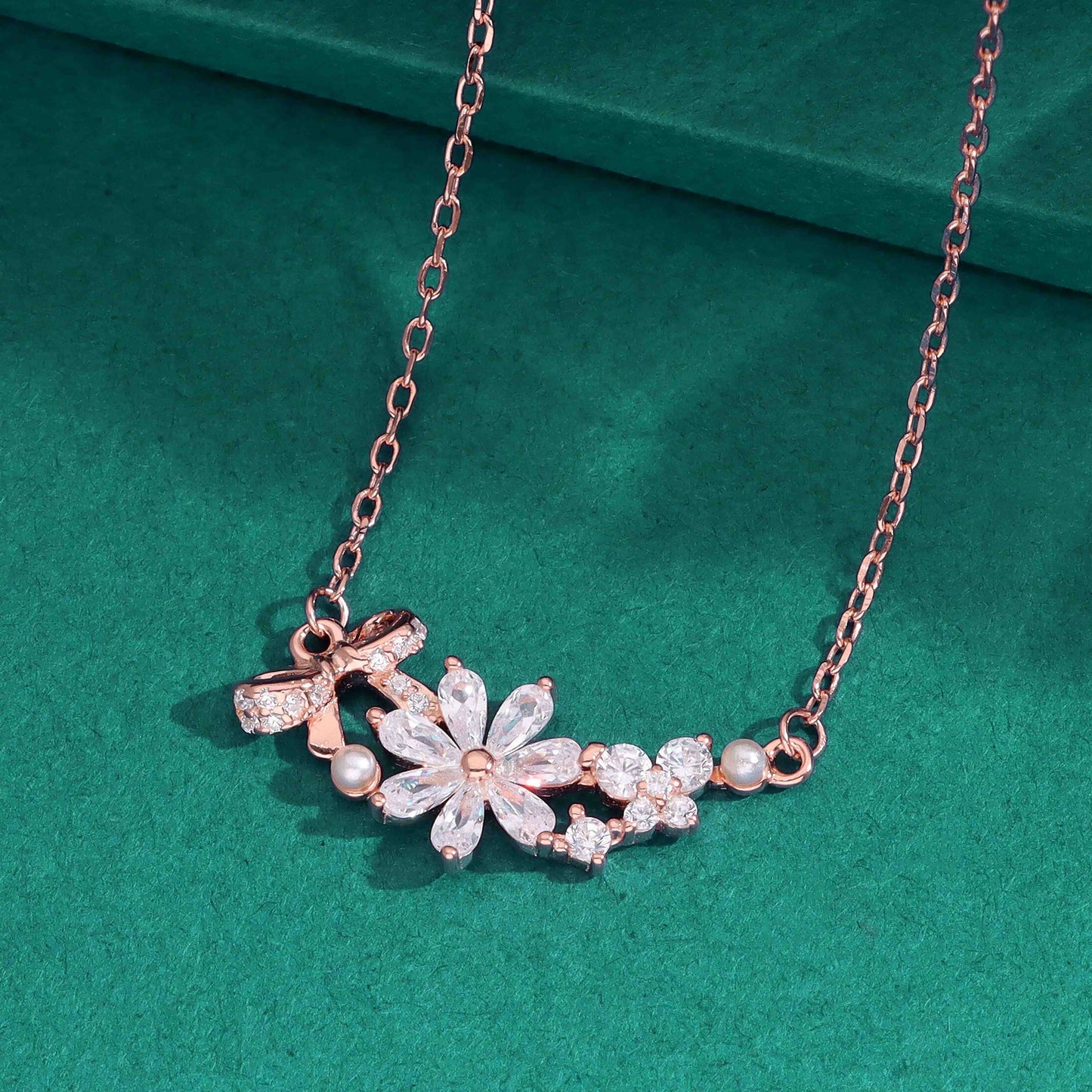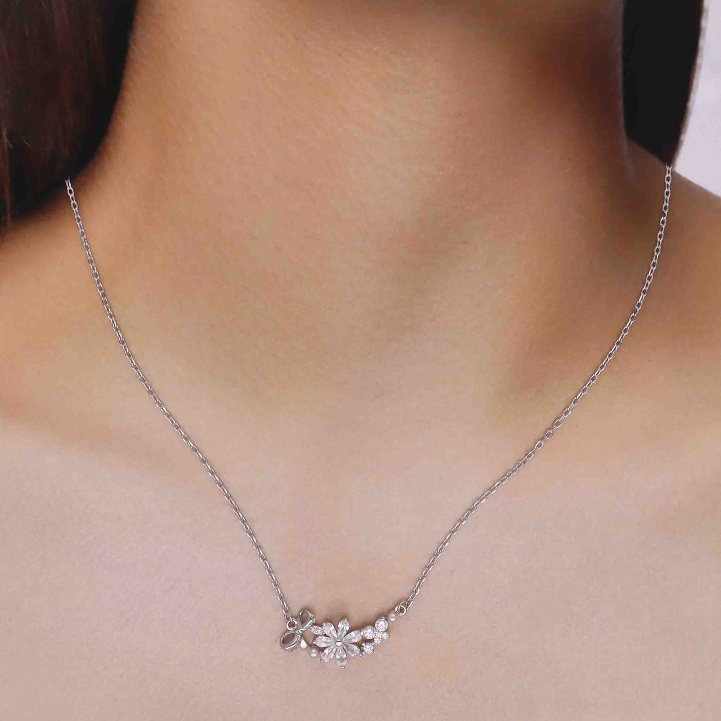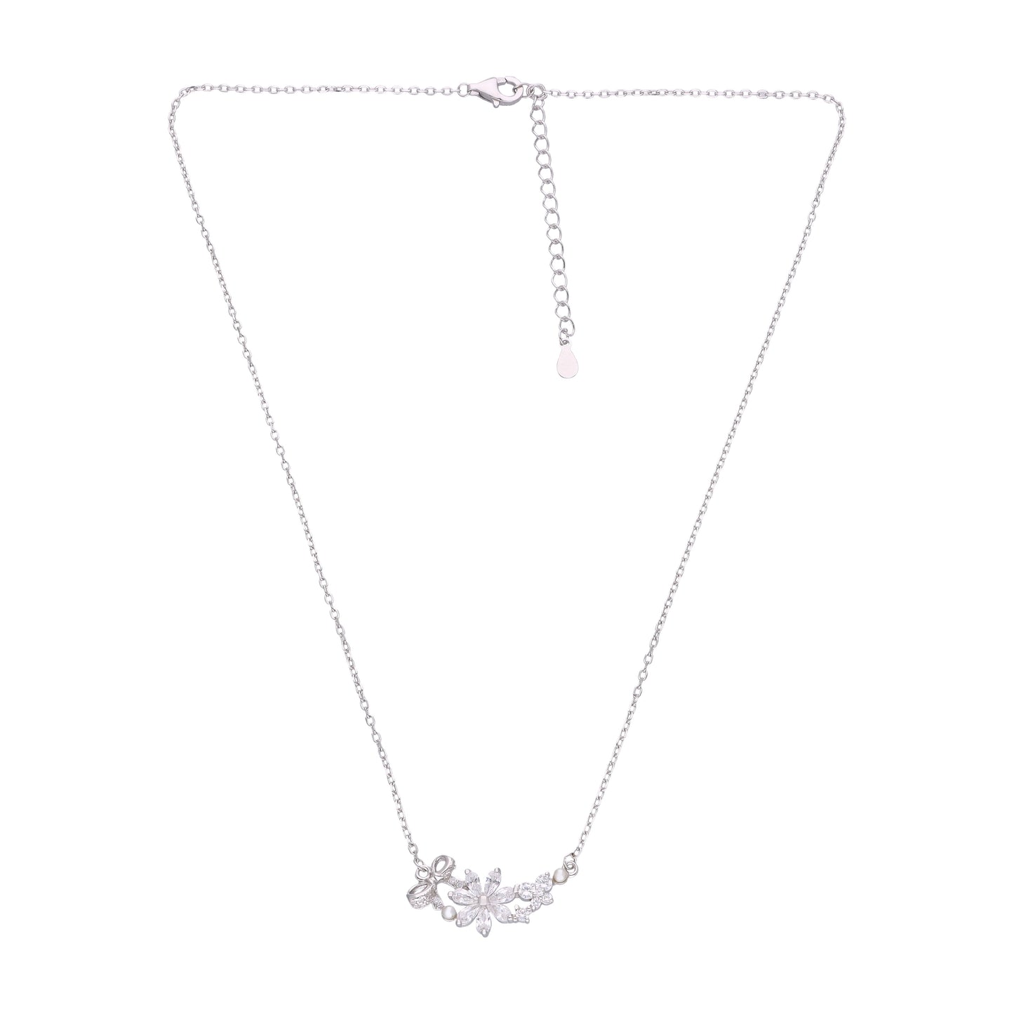 Regular price Rs. 2,669.00Elevate your look with this Elegant Floral Crystal Pendant Necklace, expertly designed to embody natural beauty. Crafted in a silver-tone finish, it features a radiant flower centerpiece adorned with sparkling cubic zirconia and refined pearl accents. The delicate bow and clustered crystal blossoms add sophisticated detail, ideal for weddings or special occasions. Its high-polish silver chain ensures lasting shine and durability, making it a timeless accessory for discerning wearers.
